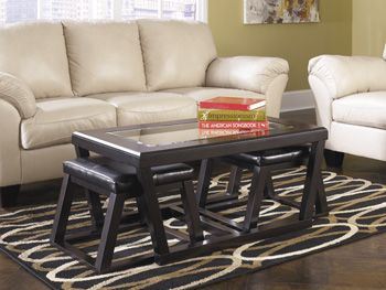 Made with select veneers and hardwood solids. Beveled tempered glass insert on cocktail table. Two nesting ottomans are upholstered in black faux leather. With bold angles and a sleek artistic design, the deep finished “Kelton” accent table collection features faux leather upholstery on the nesting ottomans along with the clean look of a beveled glass insert on the cocktail table top to create an exciting addition to any living area.
