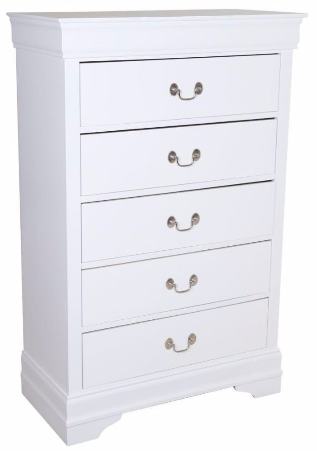 Classic Louis style in a white finish to fit various decors. French dovetail drawer fronts provide strong construction for everyday use. Metal center drawer glides will not buckle with humidity changes. Dustproof bottoms seal your case and give added strength.