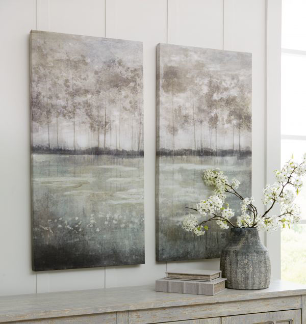 Evoking distant woodlands, this canvas wall art brings a sense of calmness and balance to a space. Textural brushstrokes add depth and visual interest to the abstract design, which lends itself to peaceful reflection. Set of 2 Gallery wrapped canvas Hand-painted embellishment Sawtooth hanger Vertical hanging only Due to the handcrafted nature of this product, some variations may occur