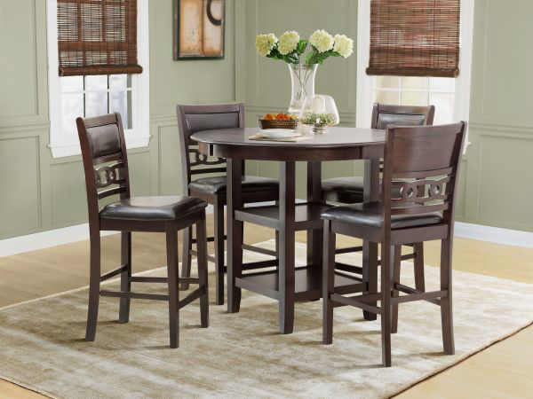 Casual Dinette features Rubberwood with Mindy Veneers. Double Display Shelves and PU Chair Cushions. Package Includes: Counter Height Table and 4 Counter Chairs