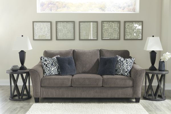 The Nemoli sofa sets the scene for a modern space full of casual flair. Its textured chenille with solid microfiber upholstery provides a luxuriously soft feel that’s inviting. Gently flared arms and plush seat cushions welcome comfort and relaxation. The on-trend slate-colored upholstery offers a perfect background for the four decorative pillows to pop with beauty.