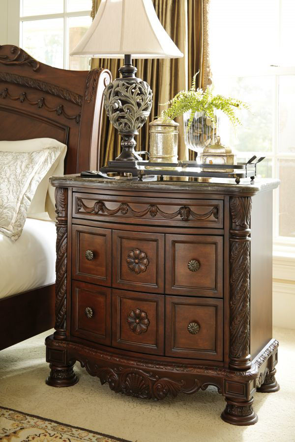 Inspired by the grandeur and grace of Old World style, this nightstand is nothing short of stunning. A choice blend of materials is accented by detailed ornamental appliques. A marble parquetry top tops off the opulence. Three smooth-gliding drawers serve your bedside storage needs exceptionally well.