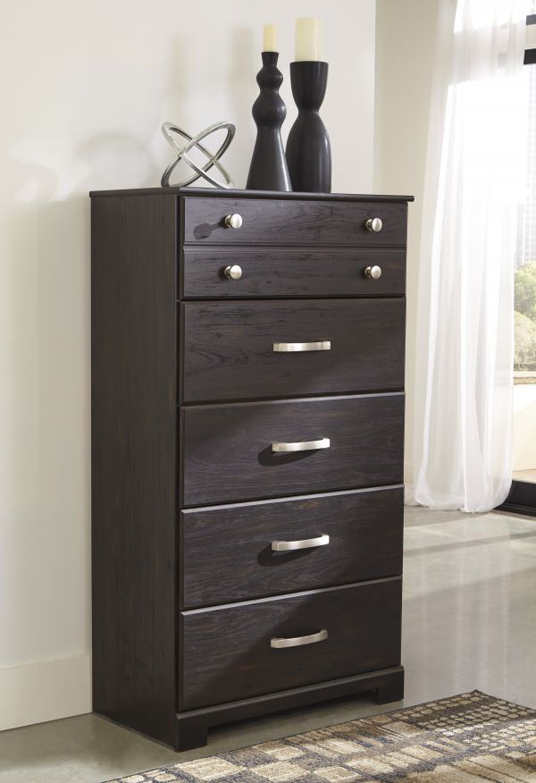 Dark brown replicated worn through paint finish. Large scaled satin nickel colored handles and knobs. Side roller glides for smooth operating drawers. Slim profile USB charger located on the back of the night stand tops. Large drawers provide ample storage space.