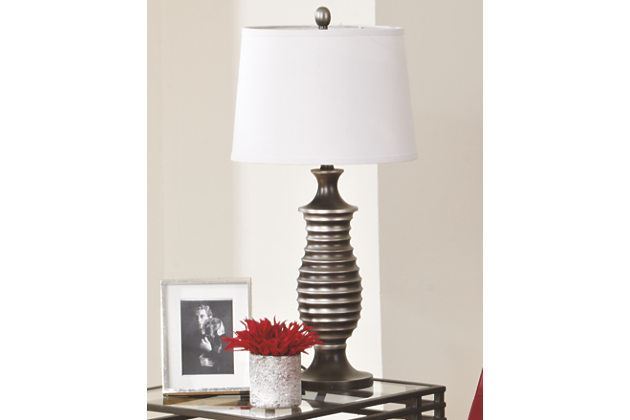 This corrugated pair of metal table lamps have an industrial-like quality, making it at home among contemporary and eclectic decor. Bathed in an antiqued finish and topped with a fresh white shade, Rory is as versatile as she is stylish.