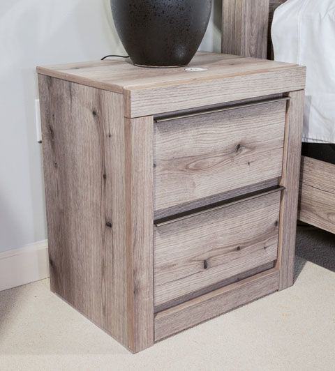 This nightstand puts the dream of a highly contemporary bedroom retreat beautifully within budget. Its inset drawers and long, polished gunmetal handles are a clean, crisp complement to the dry gray finish over replicated oak grain. Smooth-gliding drawers and options for USB and Qi wireless charging make this nightstand a versatile piece.