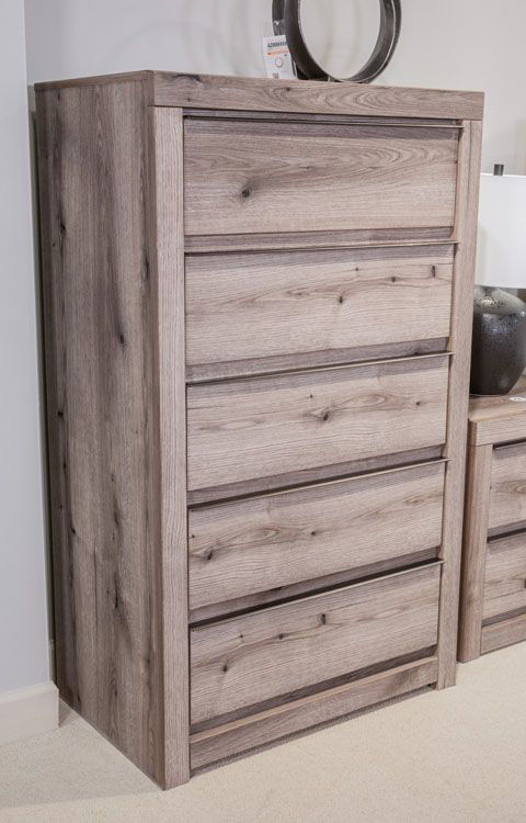 This chest of drawers puts the dream of a highly contemporary bedroom retreat beautifully within budget. Its inset drawers and long, polished gunmetal handles are a clean, crisp complement to the dry gray finish over replicated oak grain. Five smooth-gliding drawers generously accommodate your wardrobe.