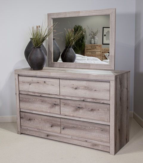 This dresser puts the dream of a highly contemporary bedroom retreat beautifully within budget. Its inset drawers and long, polished gunmetal handles are a clean, crisp complement to the dry gray finish over replicated oak grain. Six smooth-gliding drawers generously accommodate your wardrobe.