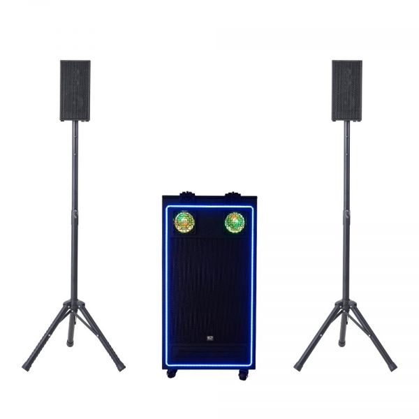 A ready to go all in one DJ package fully incorporated into one compact self contained unit. lt fulfills all of your requirements with one easily transportable, easy to set up system. While on the go, there are built in compartments for easy storage for both speakers and tripods.