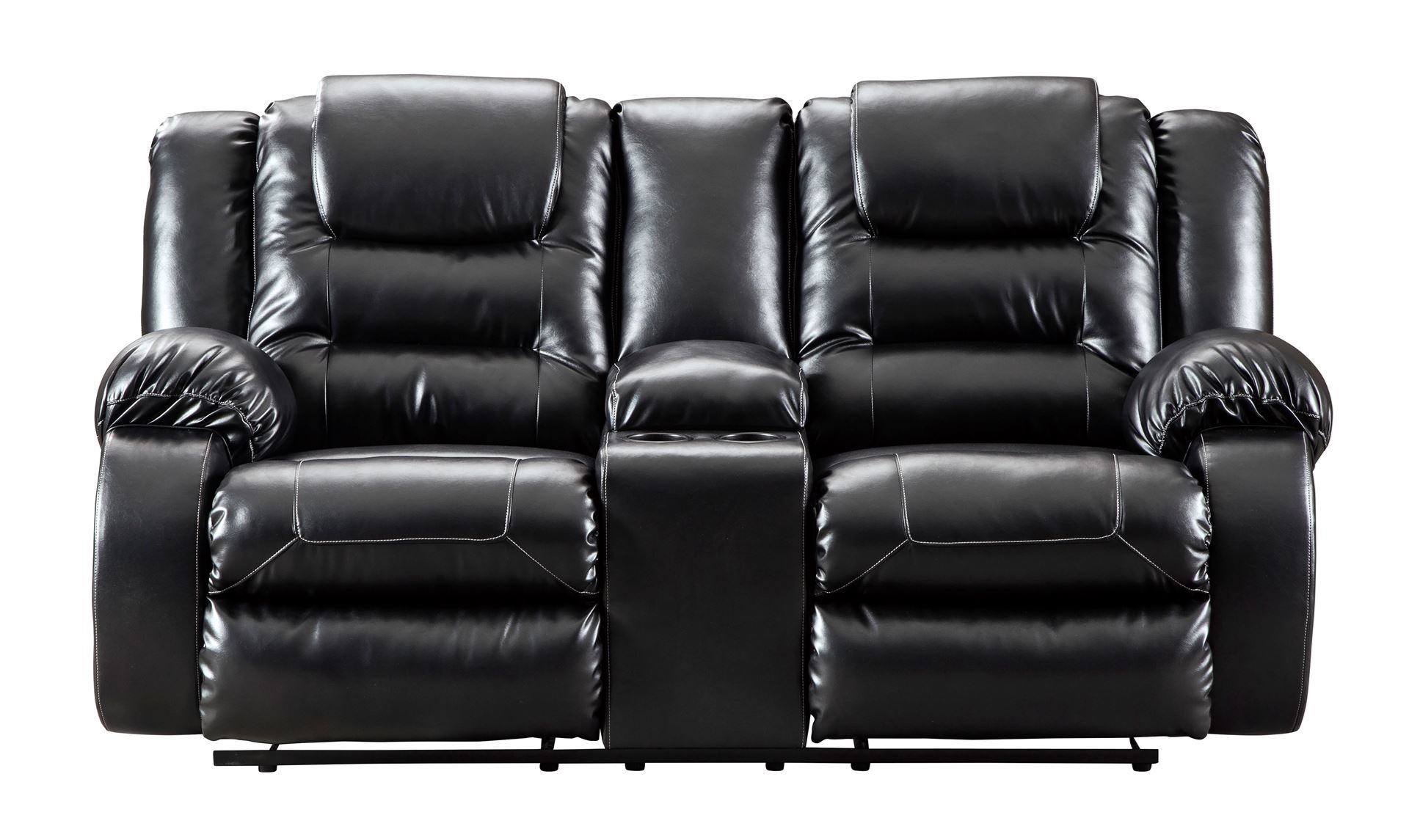 When it comes to comfort, style and value, the Vacherie faux leather reclining loveseat in black rocks. Tailored for feel-good flair, its fashion-forward bustle back design is enhanced with sculpted padding on the headrest for cradling support. Channel cushioning along the sides flows into thick, wrapped pillow top armrests that are truly over the top. And while it might look like you broke the bank, a sumptuously soft leather-like fabric keeps indulgence well within budget.