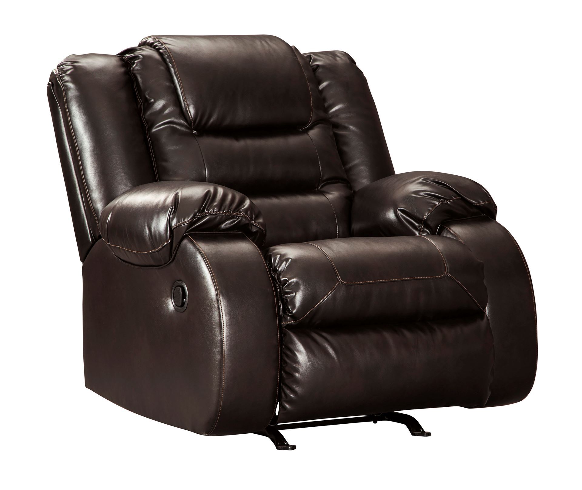 When it comes to comfort, style and value, the Vacherie faux leather reclining group in chocolate brown rocks. Tailored for feel-good flair, its fashion-forward bustle back design is enhanced with sculpted padding on the headrest for cradling support. Channel cushioning along the sides flows into thick, wrapped pillow top armrests that are truly over the top. And while it might look like you broke the bank, a sumptuously soft leather-like fabric keeps indulgence well within budget.