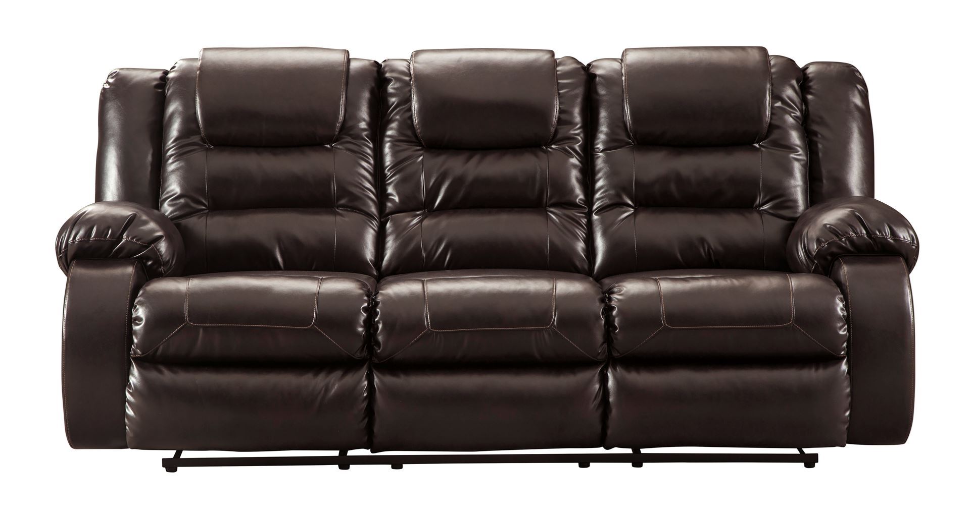 When it comes to comfort, style and value, the Vacherie faux leather reclining sofa in chocolate brown rocks. Tailored for feel-good flair, its fashion-forward bustle back design is enhanced with sculpted padding on the headrest for cradling support. Channel cushioning along the sides flows into thick, wrapped pillow top armrests that are truly over the top. And while it might look like you broke the bank, a sumptuously soft leather-like fabric keeps indulgence well within budget.