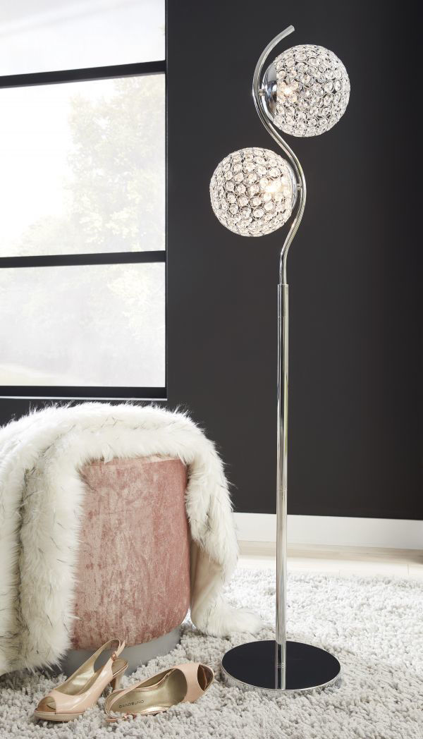 This uniquely striking floor lamp showcases the beauty of transparency. A high-gloss chrome-tone candlestick base is enriched with 2 acrylic bead and metal dome shades giving clean, classic elements a chic upgrade.